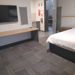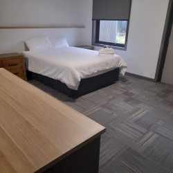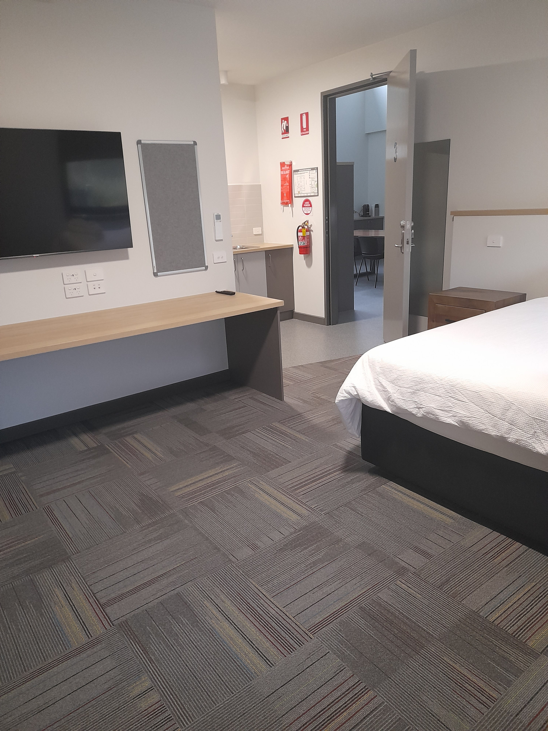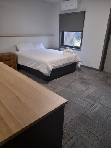 Perfect for couples, visiting professionals, or those seeking extra privacy, our Queen Apartments offer self-contained comfort with a modern touch. Each apartment includes a private ensuite bathroom, queen bed, and a personal kitchenette equipped with hot plates, microwave, kettle, and toaster. Guests can also access a stylish shared kitchen with a Nespresso machine and a cosy lounge area with Smart TV. Two fully accessible disability apartments are available. All rooms feature climate control, free parking & free WiFi.